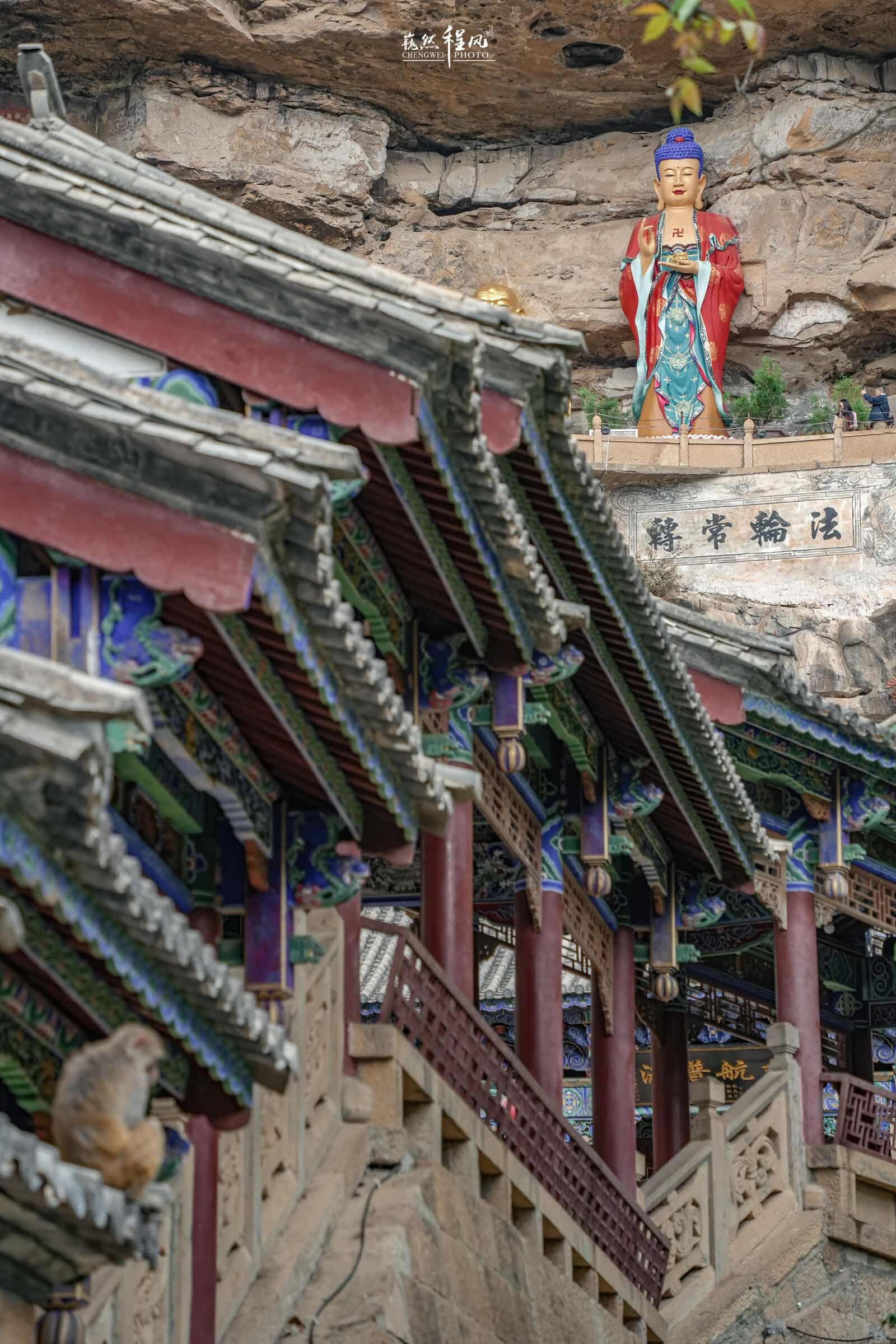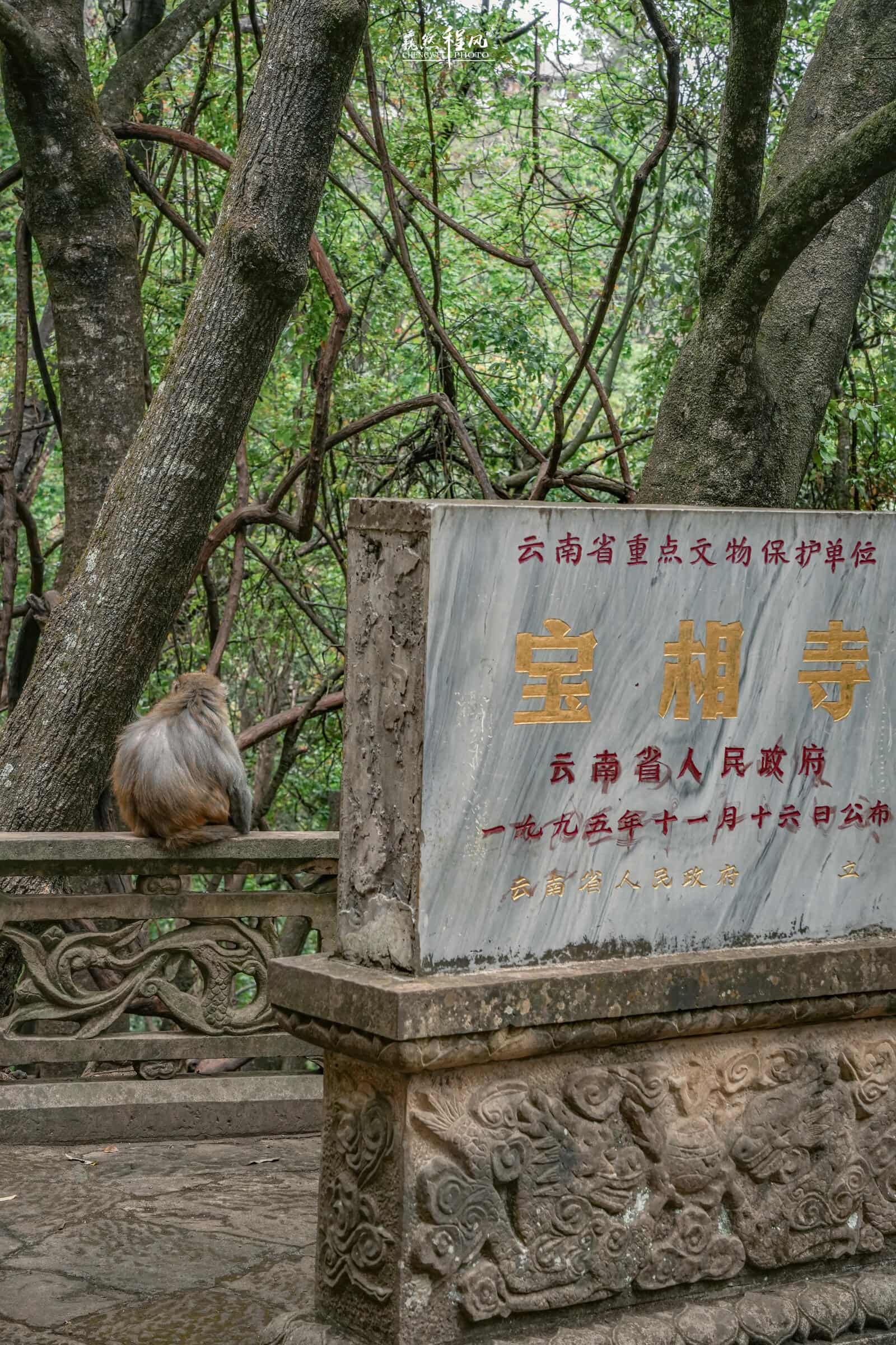 乘坐景区大巴返程时,会经过宝相寺停车点。宝相寺,位于佛顶山上,依山建筑在一堵高耸险峻的大石崖上,下层是大殿,二殿为寺观,凿石抬梁,被誉为“云南的悬空寺”始建于元代,最初为道教玉皇阁,后融佛教密宗殿堂,形成"崖窟藏佛阁,云雾绕道观"的奇观。从下车点到宝相寺山门,需徒步约15分钟的台阶,路上能遇见许多野生灵猴守护山门,活脱脱武侠片中的隐世门派。