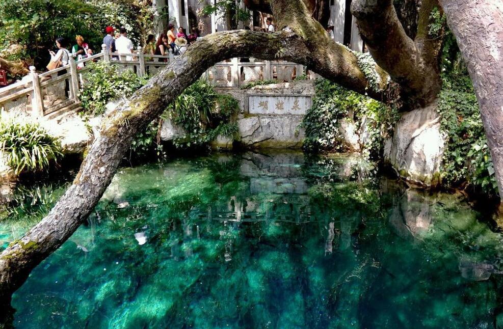 泉池四周用透亮的大理石砌成扩栏,而蝴蝶泉像一颗透明的宝石,镶嵌在绿荫之中,一串串银色水泡冒出水面,泛起片片水花,只有这个时候才能点醒你这不是个梦。