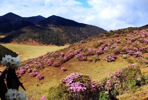 在马耳山山腰,漫山遍野的杜鹃花从四月一直开到六月多,白色、粉红色的杜鹃花和各种野花绵延不绝、错落有致,成为观赏高山杜鹃花的好去处。